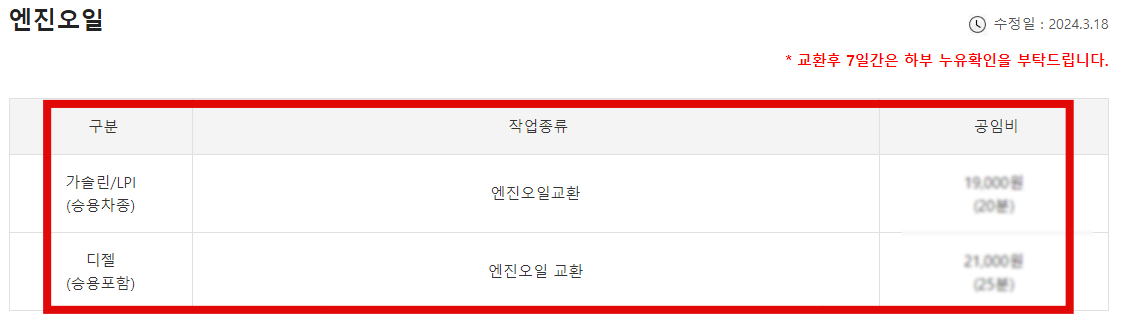 ➡️ 엔진오일의 경우 공임비가 19,000원에서 ~ 21,000원 에 형성이 되어 있습니다.